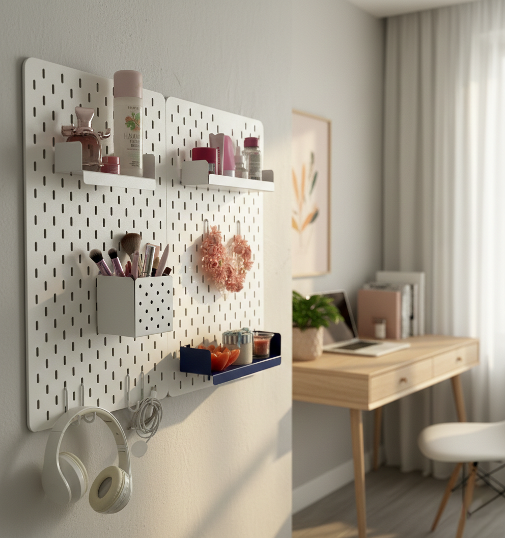 - Choisissez votre pegboard : sélectionnez la dimension (S, M ou L) et la couleur selon votre espace. Les formats compacts conviennent aux bureaux ou petites cuisines, tandis que les grands modèles s’adaptent aux ateliers et garages.